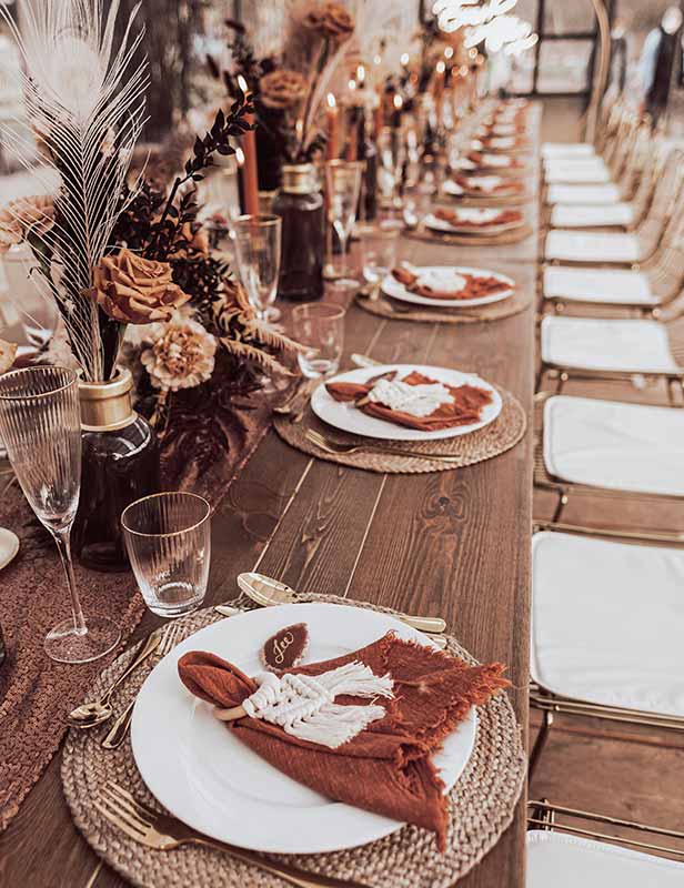 Übrigens: Wenn Ihr auf der Suche nach noch mehr Makramee und boho-vintage Highlights seid, stöbert gerne mal durch unseren Mietshop. Hier findet Ihr zum Beispiel unseren Markamee Stuhlanhänger, Tischwäsche, Platzteller und Besteck im boho-vintage Stil, Gläser mit Goldrand sowie passende Dekoration und vieles mehr.